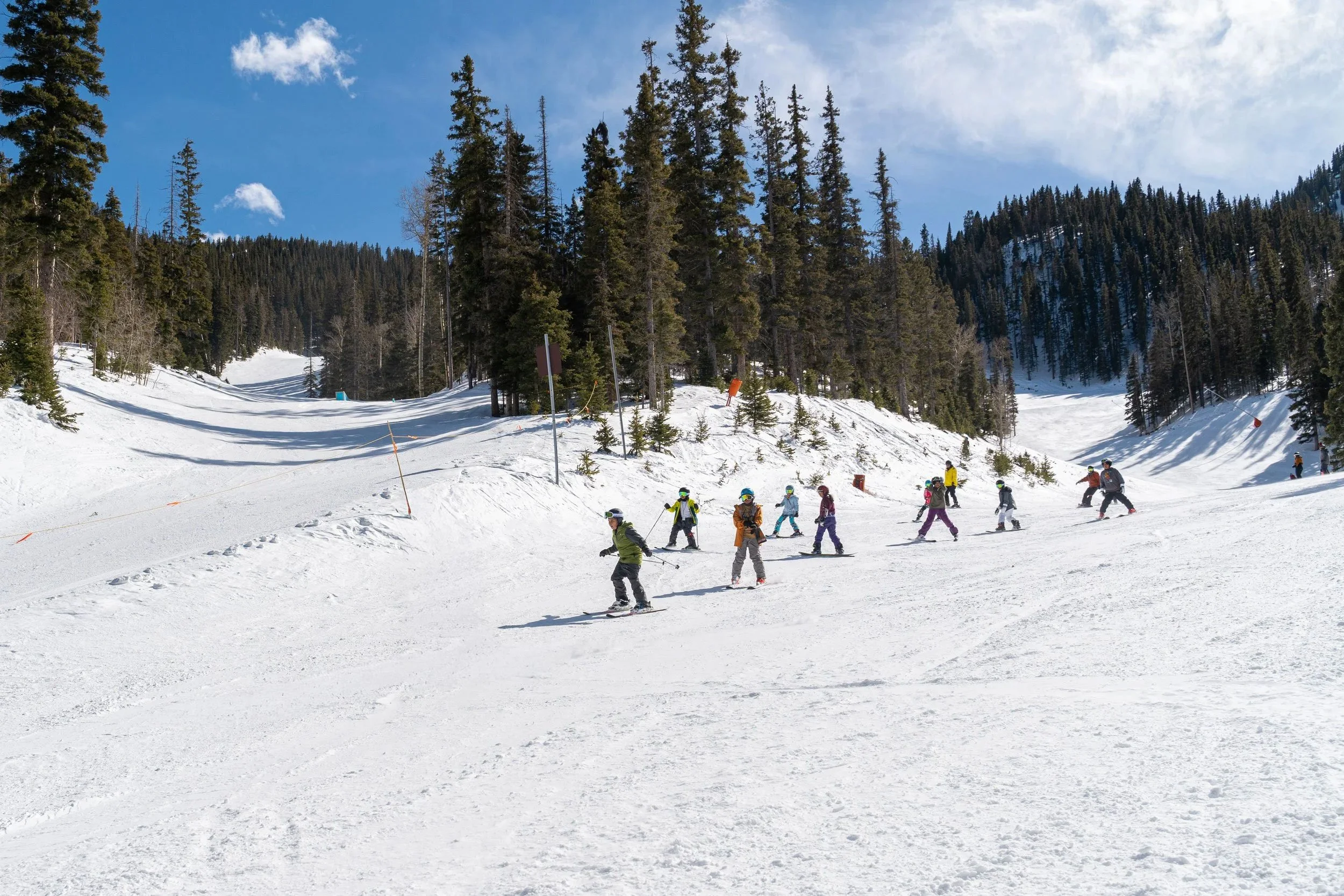 Youth receive professional lessons at Taos Ski Valley, progressing from basic skills to confident riding. All equipment, lift tickets, and meals are provided at no cost.